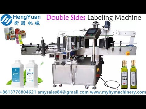 Double side labeling machine URL: http://www.myhymachinery.com/Automatic-Front-and-Backside-Sticker-Bottle-Labeling-Machine-p15.html