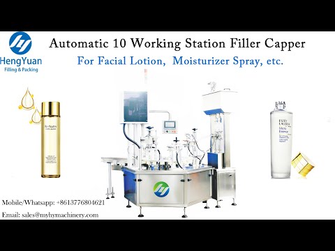 Automatic lotion, facial emulsion, makeup remover liquid bottle filling capping machine.